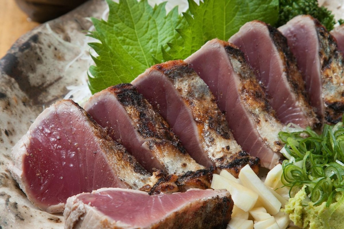 Katsuo no Tataki Kochi prefecture, facing the Pacific Ocean, is famous for its katsuo (also known as bonito or skipjack tuna), a fish highly prized in Japan The area has a number of traditional katsuo dishes, the most famous of which being "Katsuo no Tataki" To prepare the dish, a katsuo fillet is wrapped in straw and seared until it'sBroiling the katsuo will give it a smoky aroma and also reduce the excess water in the fillet, improving the texture and the flavor of the meatKatsuo No Tataki (Seared Bonito Sashimi) Katsuo no tataki is a dish of bonito fish that is seared on the outside and cut into thick sashimi slices It's garnished with grated ginger, wasabi, and sliced spring onions, and is served with ponzu, a citrusinfused soy sauce Although Kochi prefecture has become more wellknown throughout Japan for